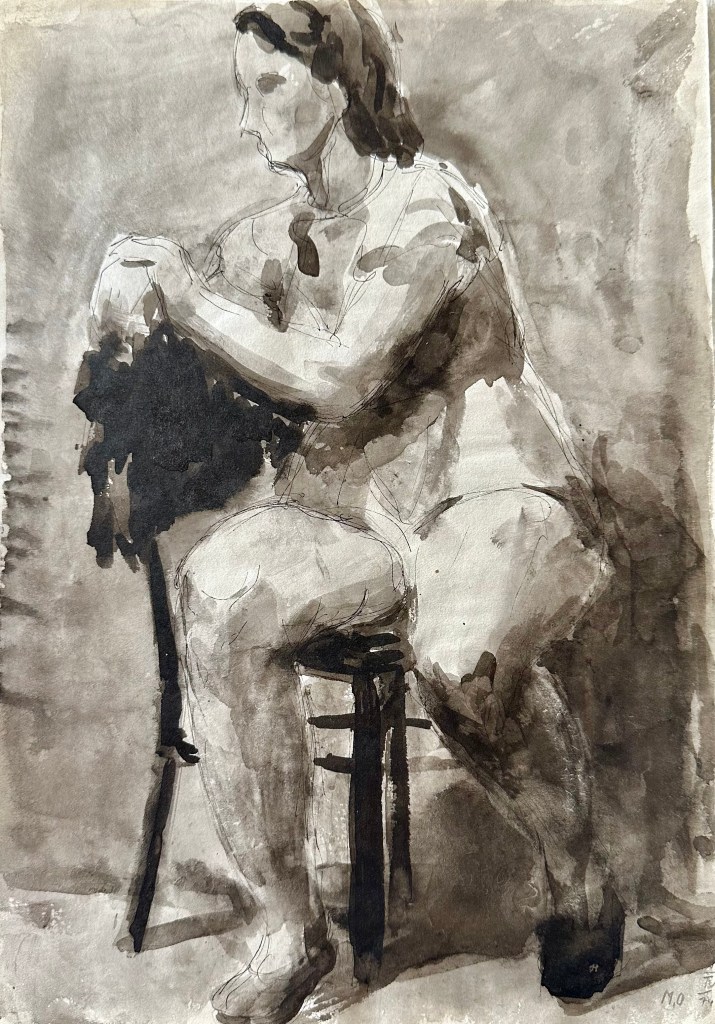Sitzender Frauenakt“ (1974) ist ein reifes, ausdrucksstarkes Blatt, das Meret Oppenheims philosophische Haltung und künstlerische Meisterschaft in konzentrierter Form zum Ausdruck bringt.